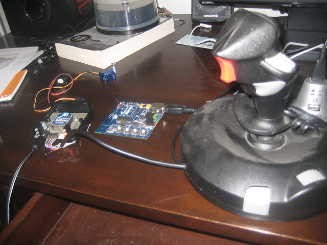 In order to use a hacked joystick, an Arduino and an XBee interface with my homemade RC airboat to control rudder and throttle.